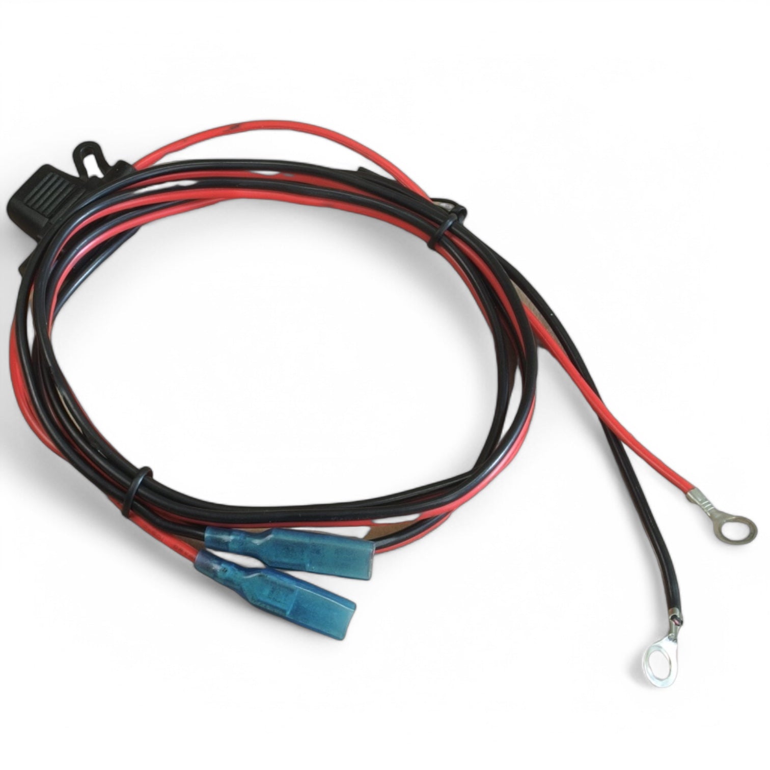 Universal cable to connect accessories directly to the motorcycle battery. Connectors match Carpe Iter power sources and controllers (Faston 6,3mm). Integrated fusebox with pre-installed automotive 5A blade burn fuse. Loops for M6 battery contacts (standard motorcycle battery).