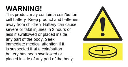 - INGESTION HAZARD: This product contains a button cell or coin battery.